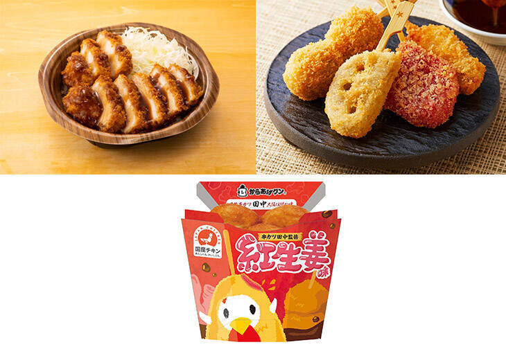 串カツ田中ソース使用 串カツ盛合せ(豚肉・うずら卵・紅ショウガ・れんこん) 年9月1日(火) 関東・甲信越エリアのローソンで先行発売! ローソン標準価格 240円(税込) 串カツの具材4種類をミニタイプにして、食べやすくカップに入れました。
